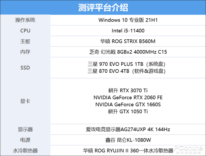 为了测试出到底什么样的配置能够流畅地运行CFHD,我们模拟了主流游戏玩家的配置平台,因为FPS电竞游戏主要吃显卡核心,我们就在其他硬件上做了固定预设,采用了相对来说主流的方案,配置图如下。