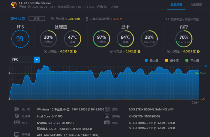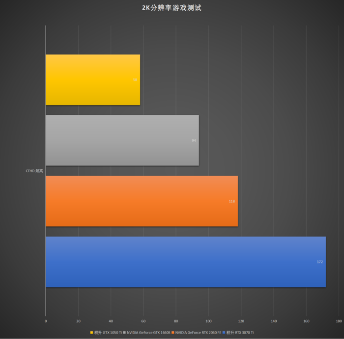 通过测试结果可以看到,CFHD在2K极高画质下对显卡还是有一定的要求的,今年刚刚发布的RTX 3070 Ti仅仅也只能跑到172帧左右,想要体验到144Hz以上的电竞级别刷新率的话,GTX 1050 Ti和GTX 1660S、RTX 2060是注定无缘了,但后两款显卡都有着90帧以上的表现,在日常游戏中还是感觉不到明显卡顿的,而GTX 1050 Ti平均60帧也没有过分卡顿,追求2K画质的小伙伴忍一忍也是可以玩的。